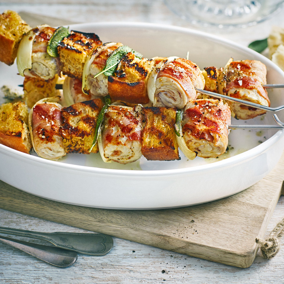 3. Den Grill anheizen. Salbei abbrausen und trocken schütteln, die Blätter abzupfen. Weißbrot in 3 cm große Würfel schneiden. Die Gemüsezwiebel schälen und vierteln, die Zwiebelschichten auseinanderlösen. Die Holzspieße trocknen, ölen und abwechselnd Zwiebelstücke, Salbeiblätter, Putenröllchen und Weißbrotwürfel aufstecken. Alles gut mit Olivenöl bestreichen.